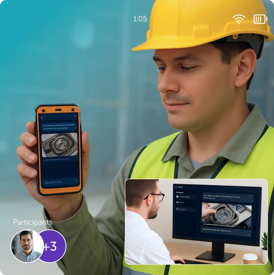 Anotaciones AR en Vivo: Los expertos pueden dibujar, señalar y colocar «puntos azules» directamente sobre el campo de visión en vivo del técnico. Estas anotaciones permanecen ancladas al equipo físico incluso si el técnico se mueve.